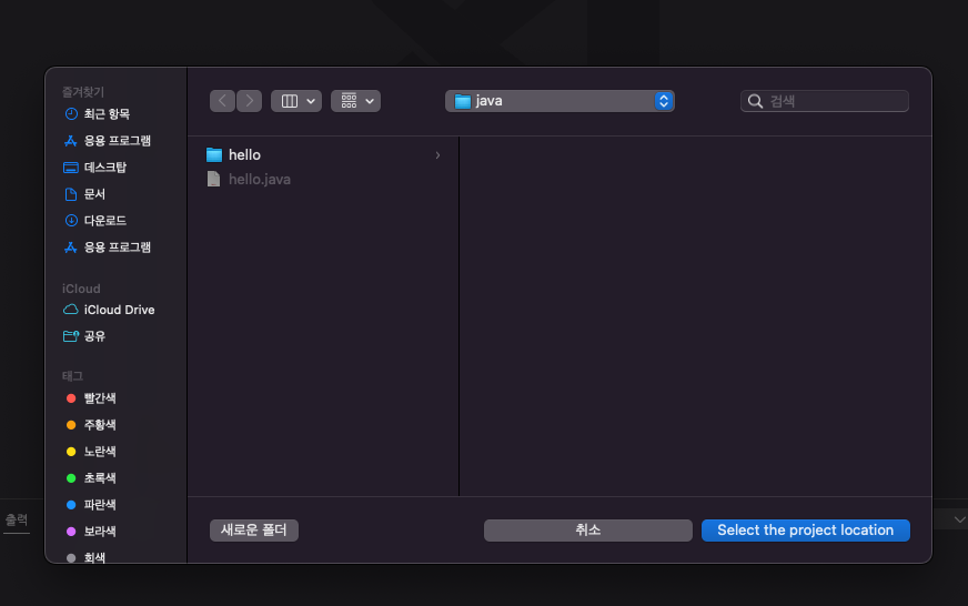 hello 폴더 안에 저장을 해볼 것이다. hello 폴더를 선택하고 아래의 'Select the project location'을 눌러준다.