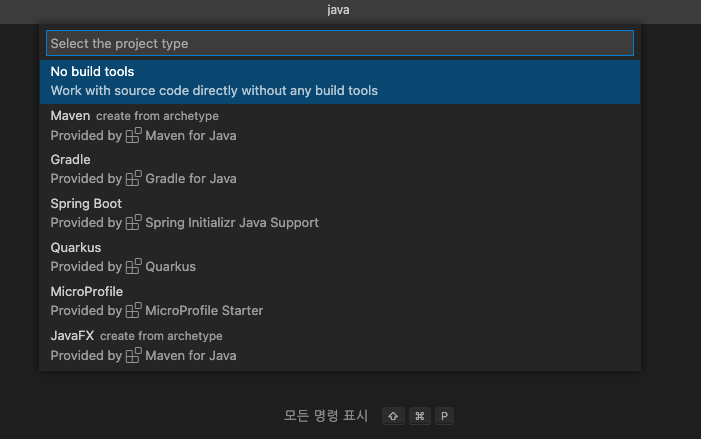입력 창에 "Java: Create Java Project..."를 치고 눌러 주면 아래의 화면이 나온다.
