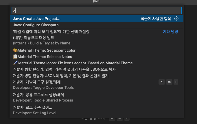 입력 창에 "Java: Create Java Project..."를 치고 눌러 주면 아래의 화면이 나온다.