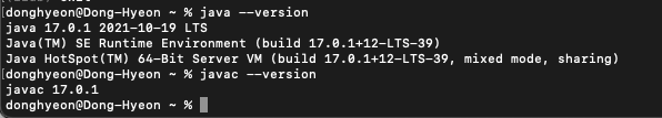 java --version과 javac --version을 터미널에 쳐서 확인을 해야한다.