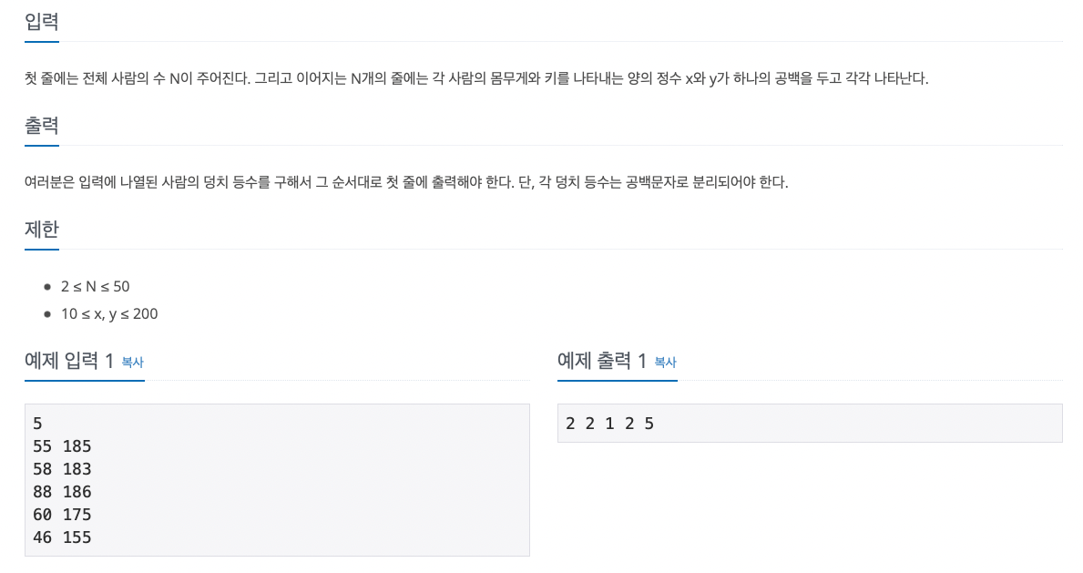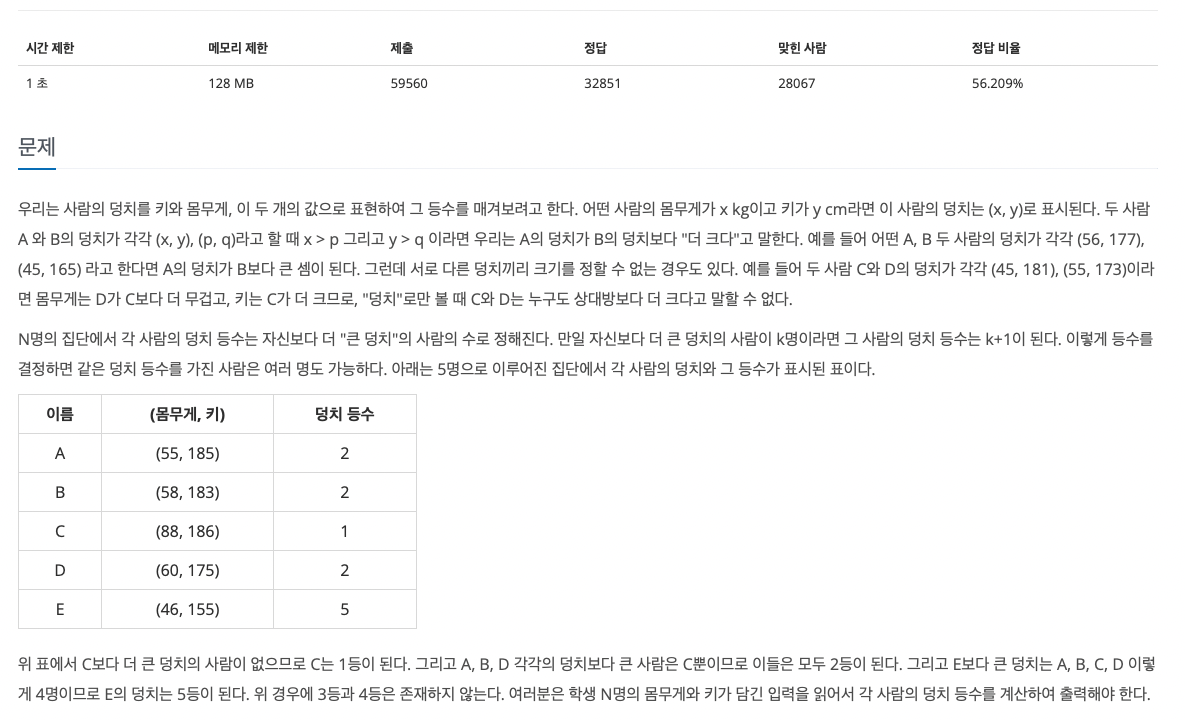 덩치의 순위를 출력하라는 것인데, 덩치가 몸무게 + 키 값이 아니라