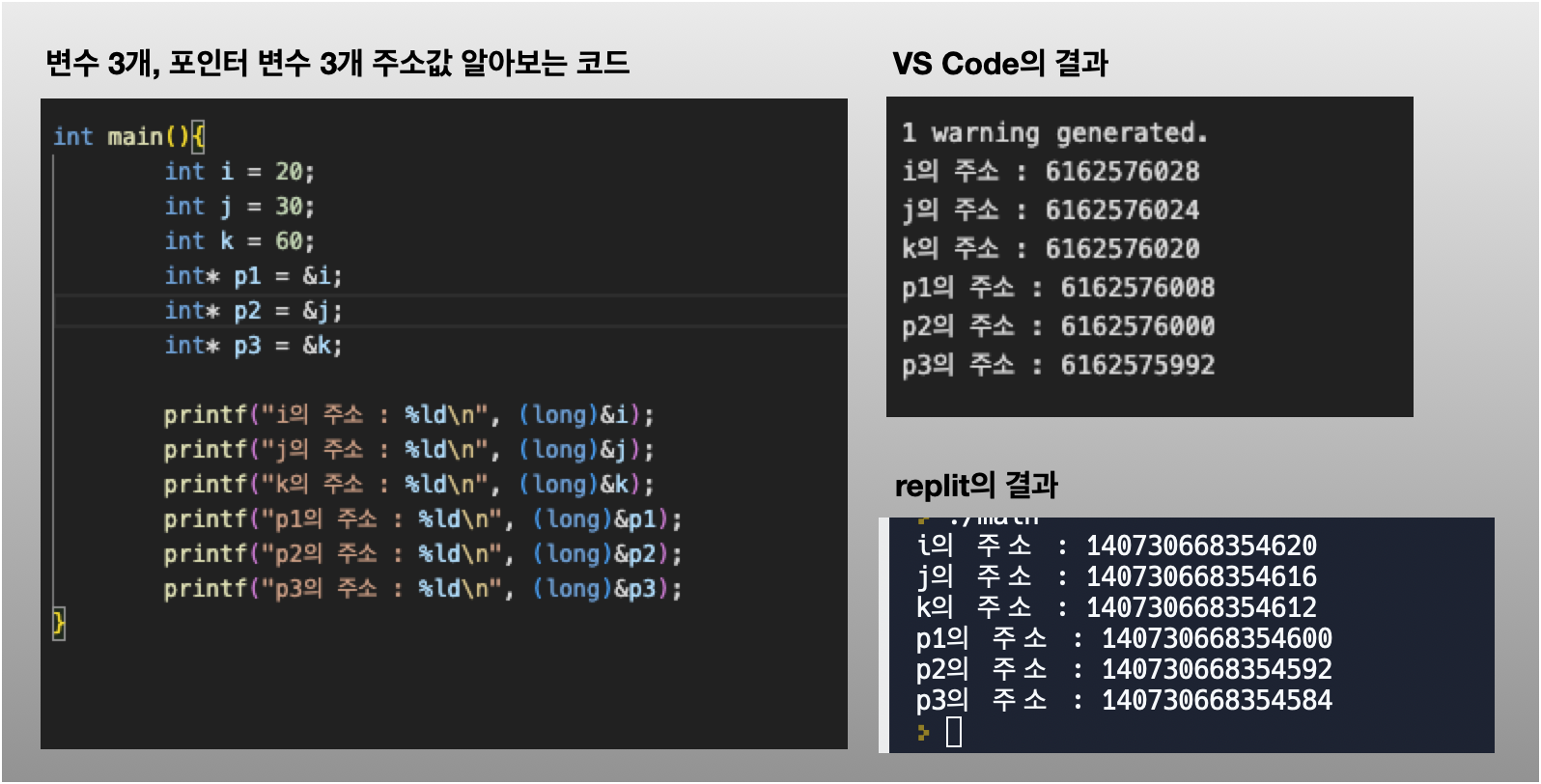 i, j, k의 주소는 각각 4씩 차이가 나는 것을 알 수 있지만, 포인터 변수의 경우, 메모리 주소 크기 차이가 12가 날 때도 있고, 8이 날 때도 있다. 포인터 변수의 크기는 8이다.