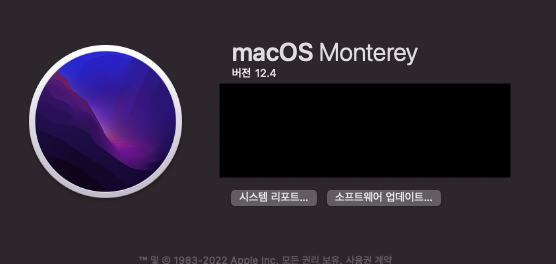 맥북 상단의 사과 로고 - 이 맥에 관하여를 클릭해주면 다음과 같은 창을 만날 수 있다.