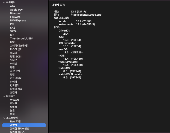여기에서 개발자라는 탭을 클릭했을 때, 다음과 같은 정보가 나오면 설치에 성공한 것이다.