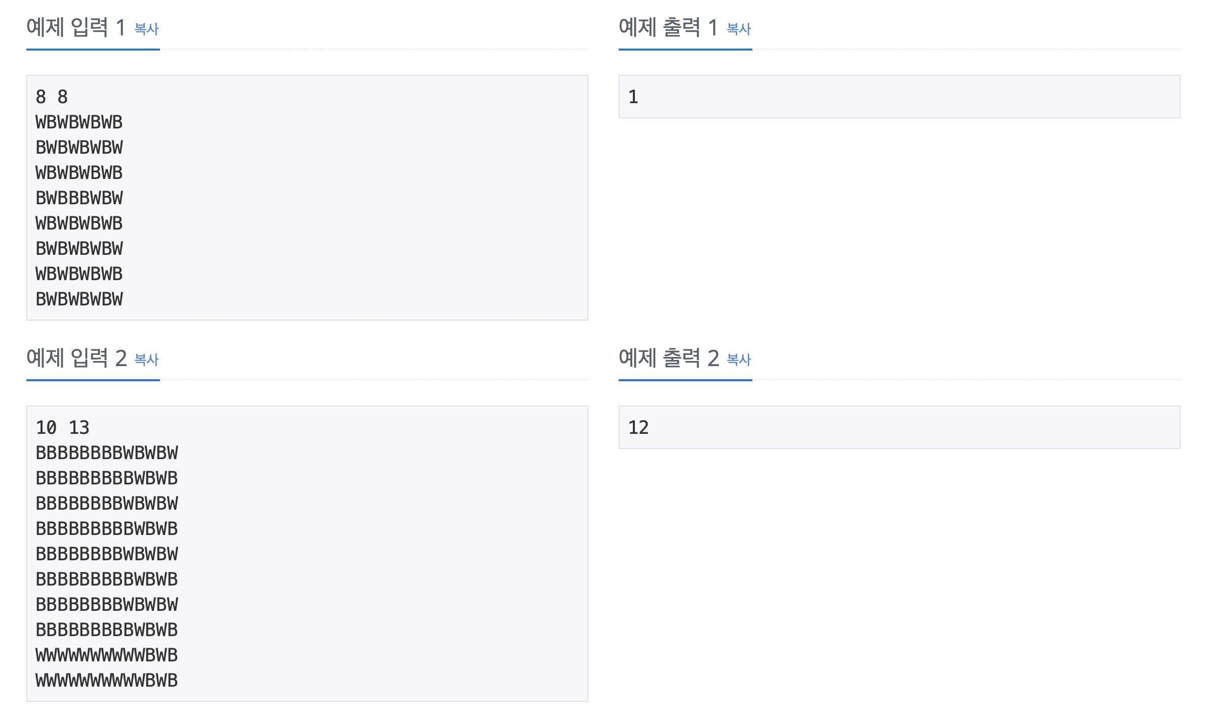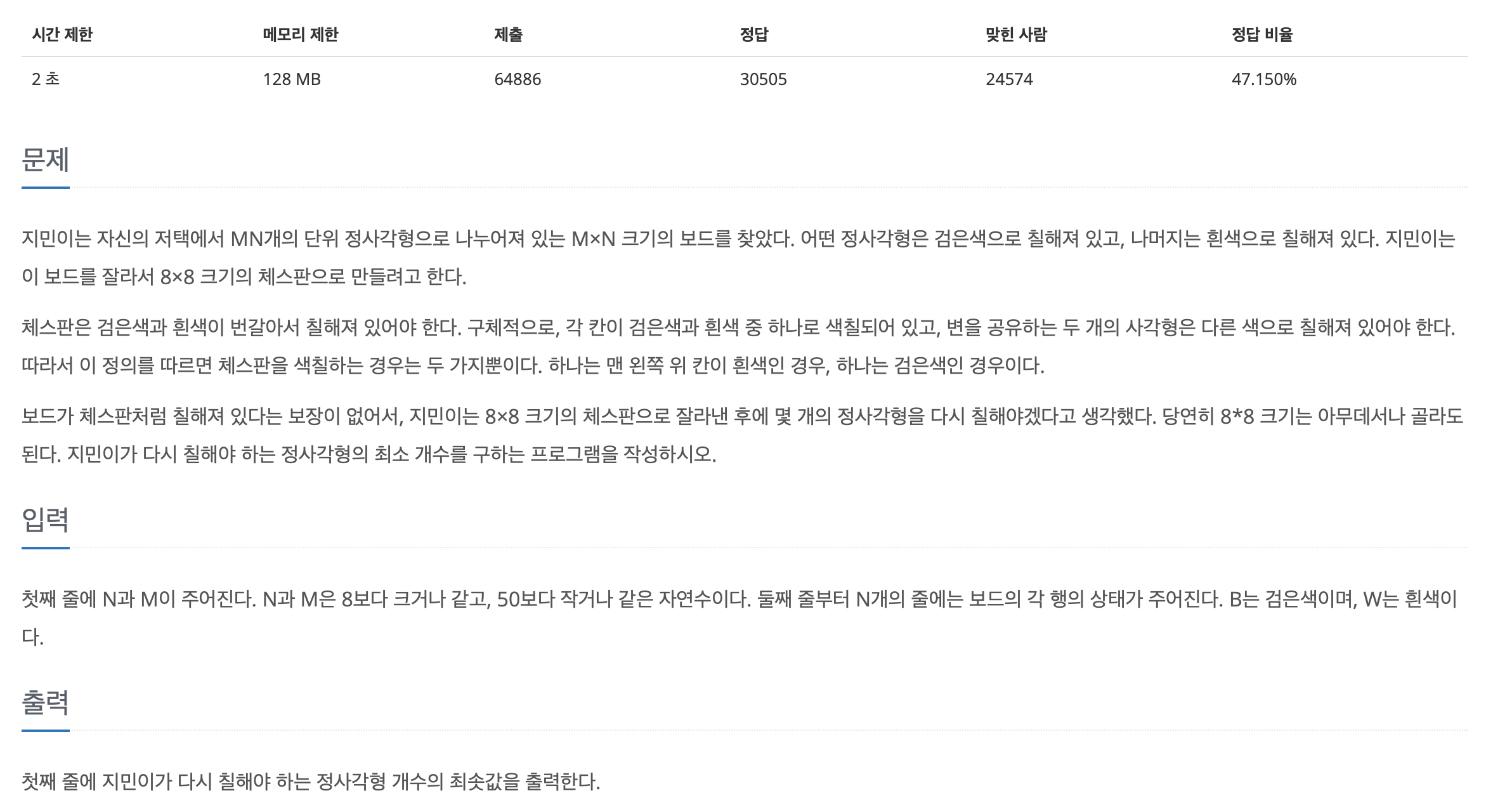 ## W 또는 B가 먼저 시작하는 보드판으로 바꾸기 위해 색칠해야 하는 정사각형 개수를 세는 조건문