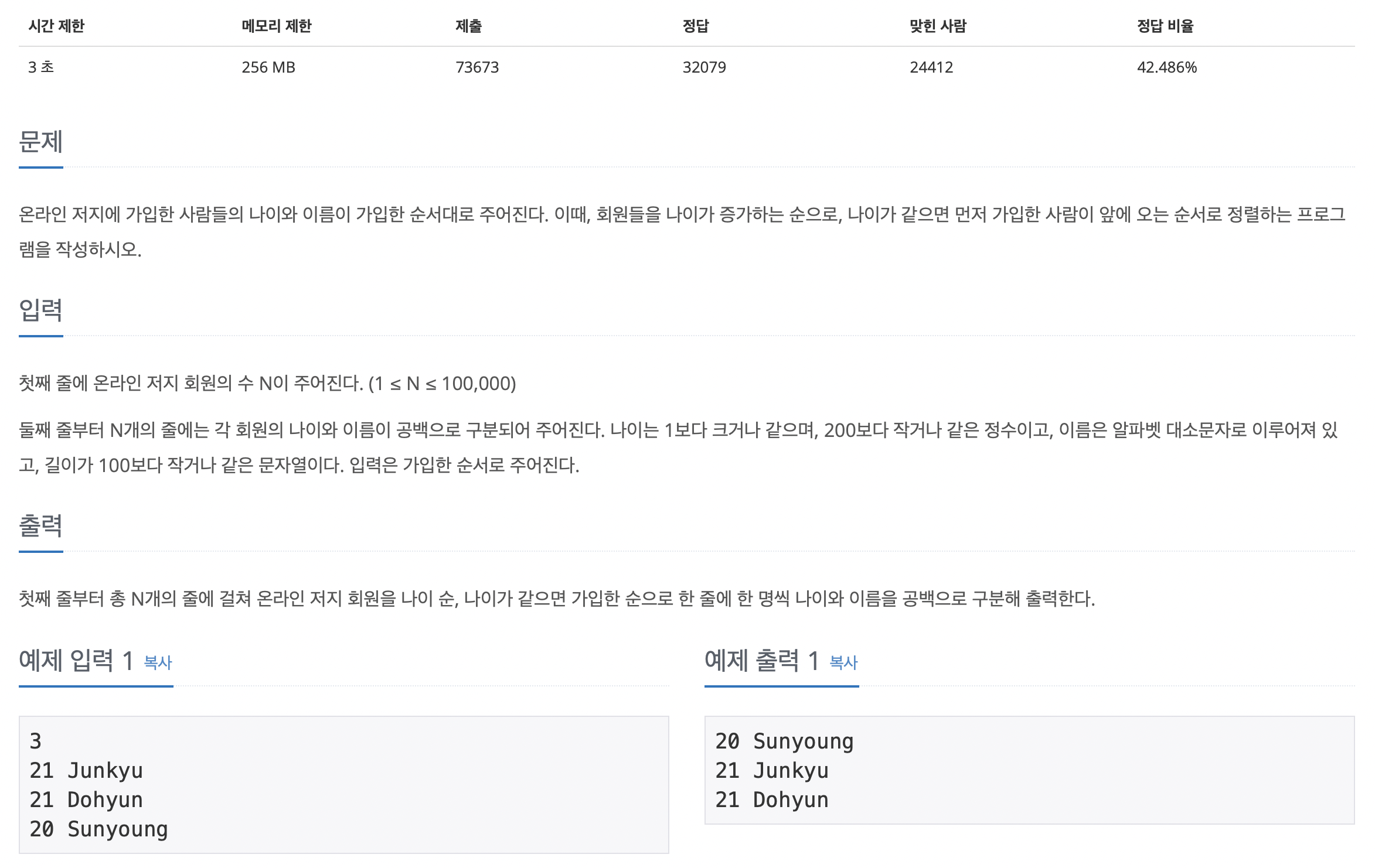 이차원 배열을 만들어서 이차원 배열 내에 있는 나이들을 비교하고, 2중 for문을 활용해서 member_list 내의 요소들을 비교하여 재정렬 한다. 그렇지만, n이 10만이기 때문에 시간적인 면에서 실패할 수 밖에 없었다.
