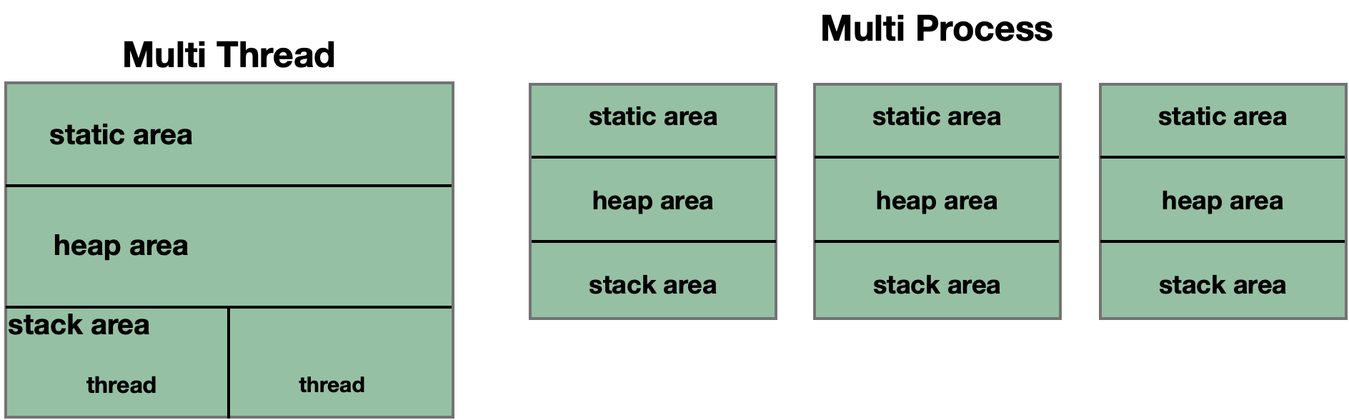 여기에 유사 개념이 있는데, 멀티 프로세스는 메모리 자체를 분할해서 고유의 스택, 힙, 데이터 메모리 공간을 가지는 것이다.
