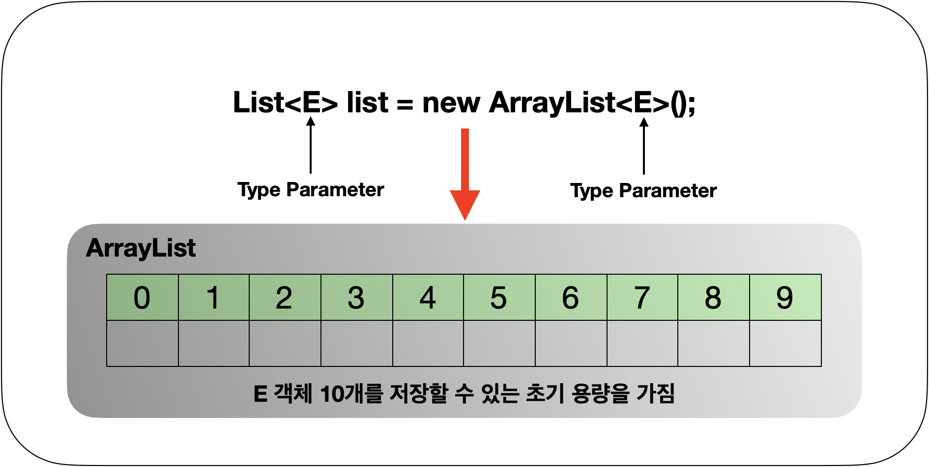 이렇게 하면, String 객체 10개 정도를 저장할 수 있는 초기 용량을 가진 ArrayList 객체가 생성된다.