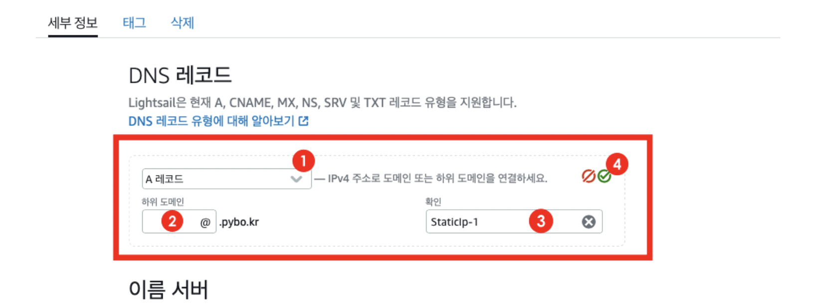 (4) A 레코드를 선택하고, 하위도메인에는 @를 입력한다. 그리고 확인에는 이전에 등록한 고정아이피를 선택하고, 체크 표시를 누른다.