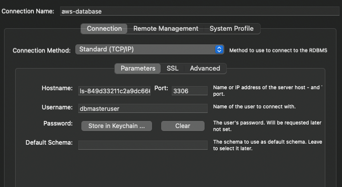 워크벤치 연결 설정값을 이렇게 해주면 된다. 호스트 네임에 엔드포인트를 써주고, 유저네임에 dbmasteruser를 입력하면 된다. 포트는 3306이다.