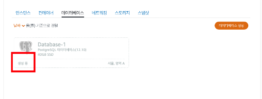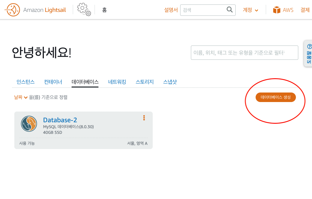 홈 - 데이터베이스 탭으로 넘어가서 데이터베이스 생성 클릭