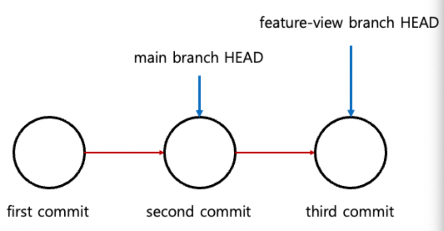 만약 메인 브랜치에서 git merge feature-view 명령어를 실행하면, main 브랜치의 HEAD가 feature-view 브랜치로 옮겨진다.