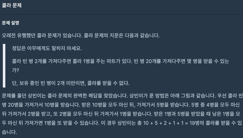 이 반복을 emptyBottle이 a 미만이 될 때까지 반복해주는 것이다. while의 조건을 통과하지 못하는 순간 탈출할 것이고, cokeCount를 리턴한다. 그러면 먹은 '콜라의 개수'를 온전히 셀 수 있다.