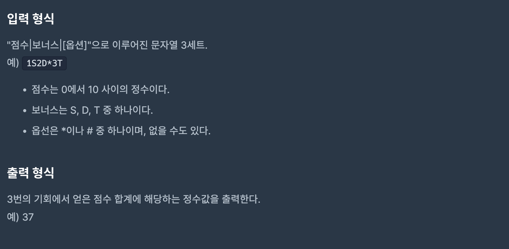 dartResult를 한 Character로 끊어서 읽고, 숫자 또는 문자라면 그 안에서 적절하게 분기를 해주고, 만약 그 둘이 아니라면 * or # 이므로 그에 따라 이전 회차의 점수를 두 배 시켜주거나 하나만 두 배를 시켰다.