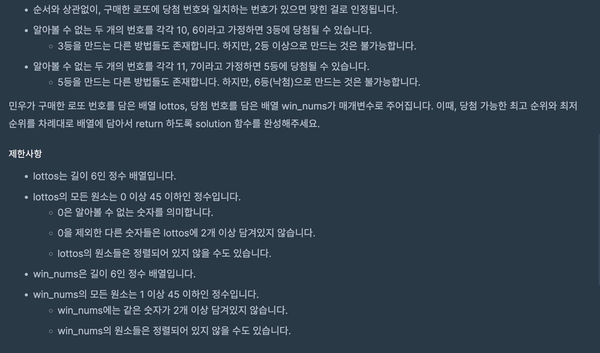 첫 번째 반복문에서는 unknownNumberCount / currentMatched로 변수를 나누어 count를 한다. 현재 랭크는 currentMatched가 몇 개냐에 따라서 달라진다. 그런 다음, 최대 등수와 최저 등수를 return 해주는데, 여기에 unknownNumberCount를 뺀 숫자는 최대 등수로, currentRank 그 자체를 최저 등수로 해서 리턴한다. 왜냐하면, 0이 주어지더라도 모두 못 맞힌다는 가정을 하면, 최저 등수가 되기 때문이다.