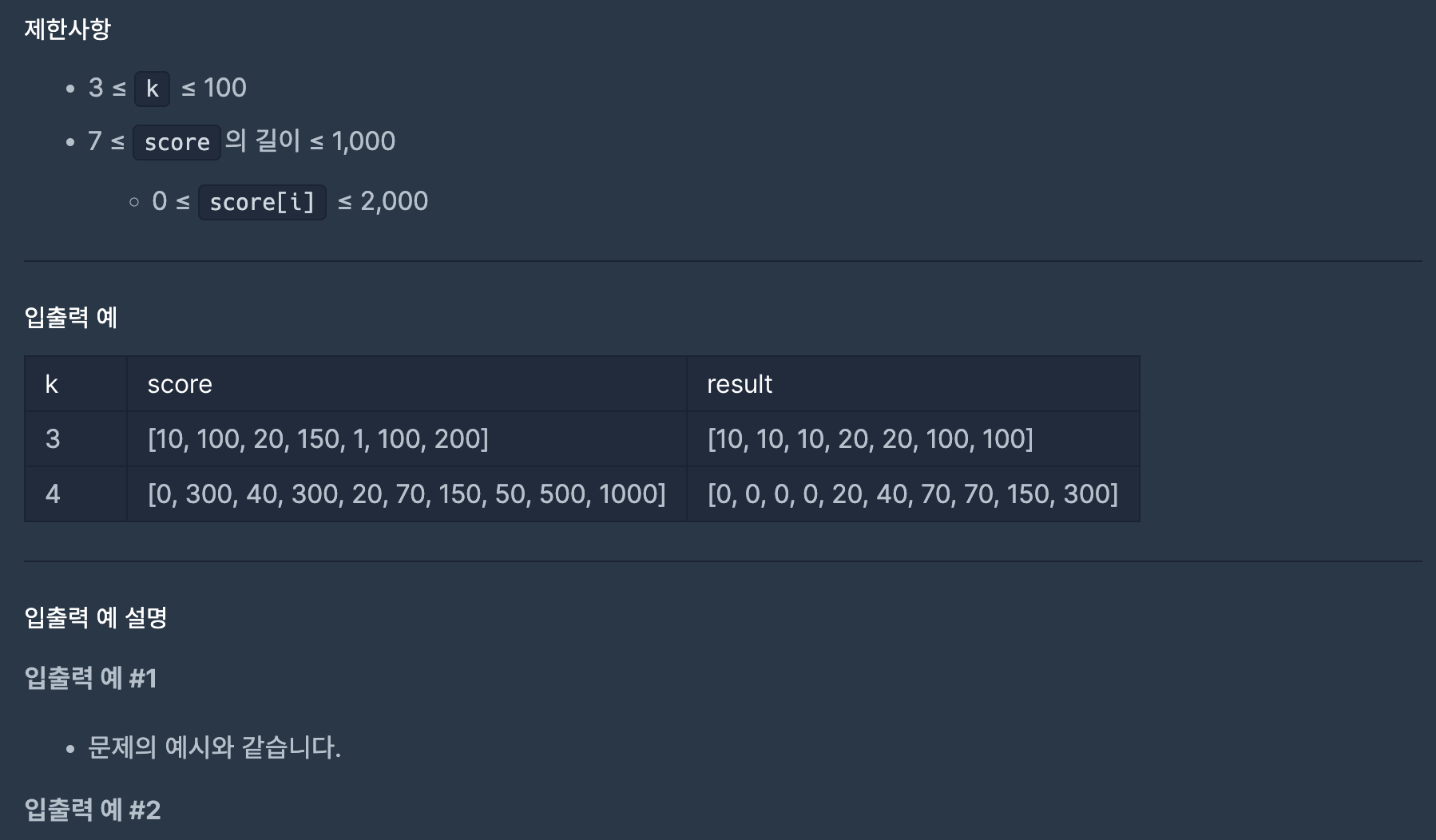 이렇게 score 전부를 순회하고 나면, 문제에서 요구하는 바와 같이 구현을 할 수 있다.