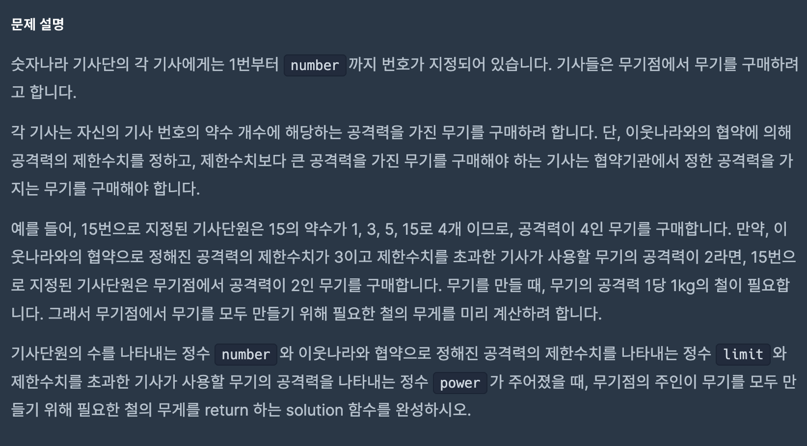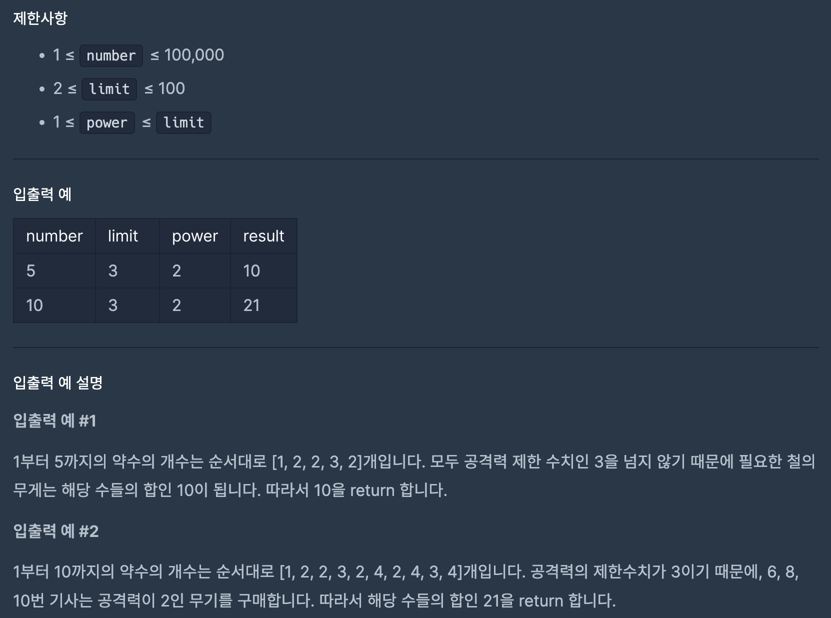 약수의 개수를 세는 로직이 가장 중요하다. number가 10만이기 때문에 O(N) 시간으로 약수를 찾으면 타임 오바가 난다.