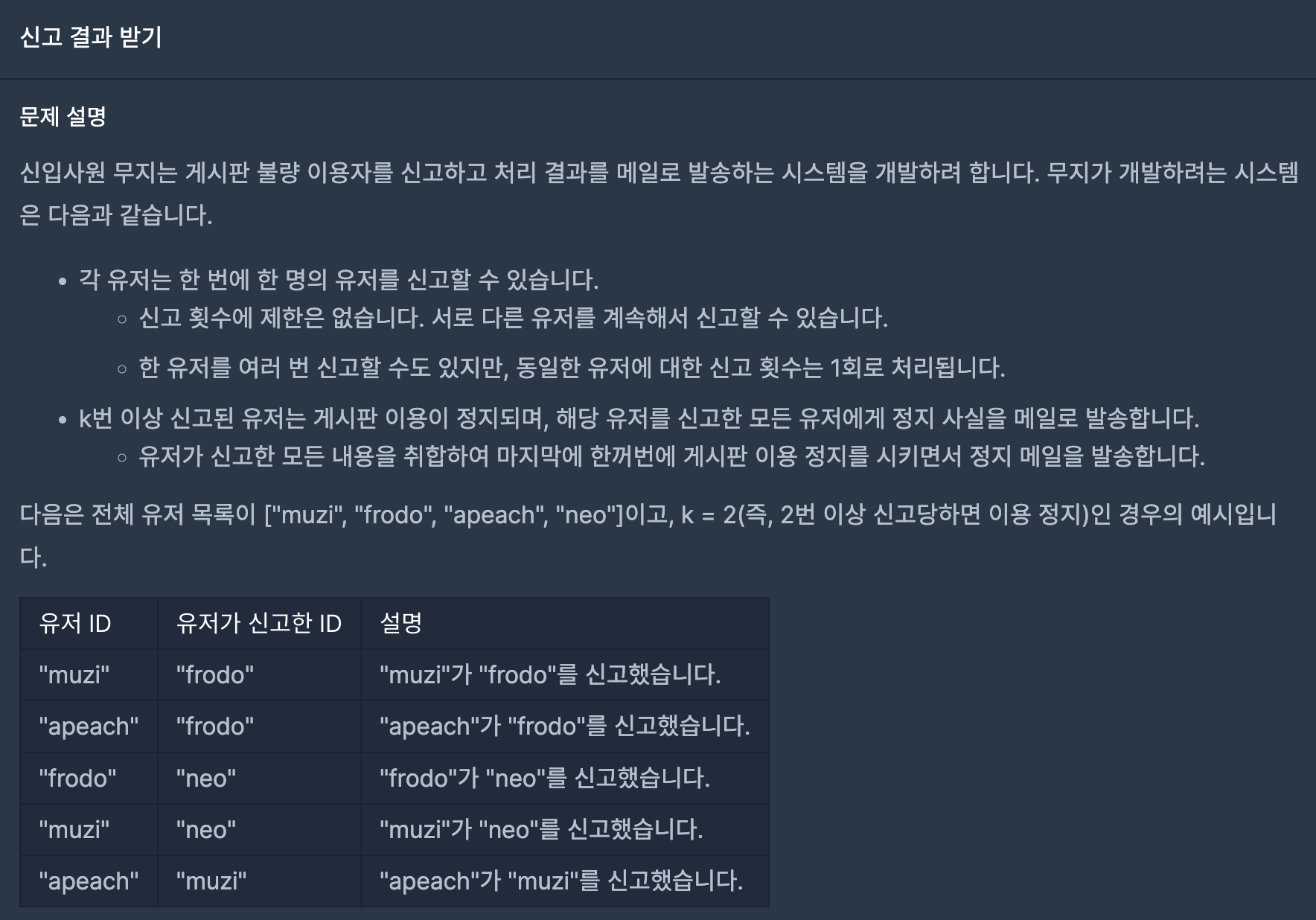 그래서 reportCount 딕셔너리에는 id를 key로, set을 value로 만들어 신고한 사람이 총 몇 명인지 셀 수 있게 해주었다.