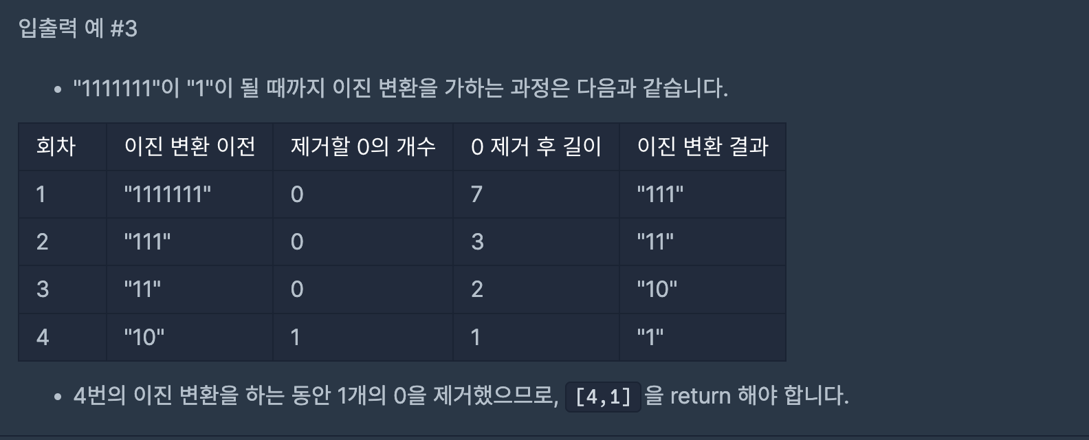 while문을 활용하여 없어진 0의 개수를 count 하여 누적합 처리하고, 필터를 사용하여 "1"로만 구성되게 한 다음, 그 문자열의 길이를 다시 이진수로 변환하는 과정을 거친다. 이진수로 변환을 할 경우 loopCount, 즉 이진변환의 횟수를 그 때 1 더해주면 될 것이다.