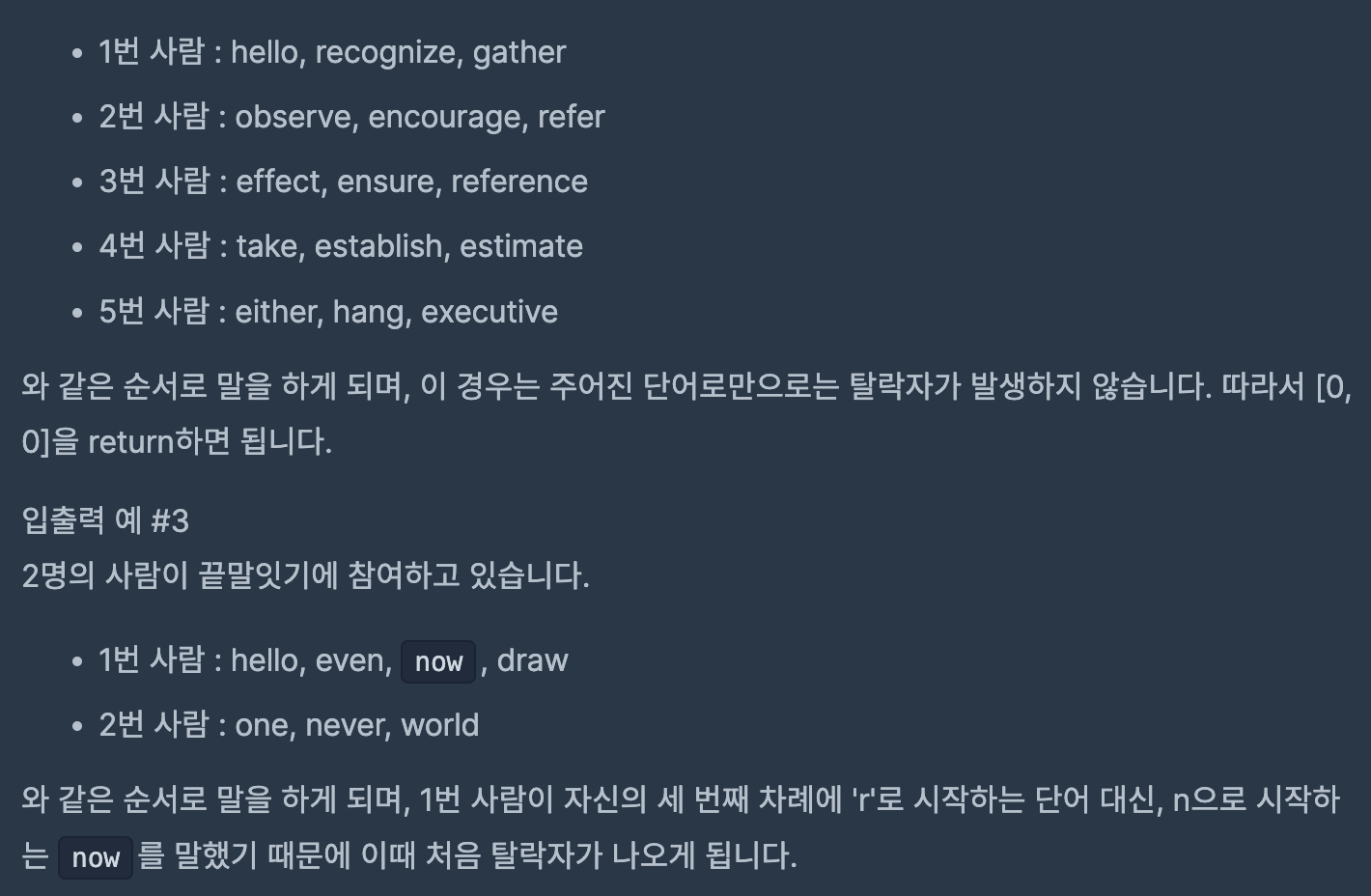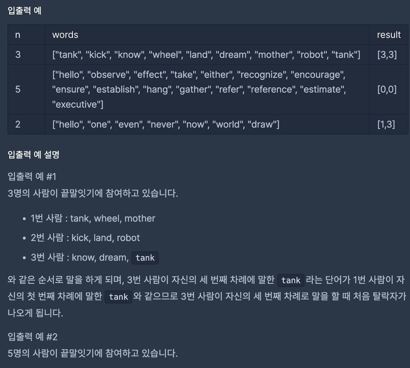 문제가 길긴 했지만, '탈락하는 사람'이 누구인지, 몇 번 째 턴에서 탈락한 것인지를 구하면 되는 문제이다.