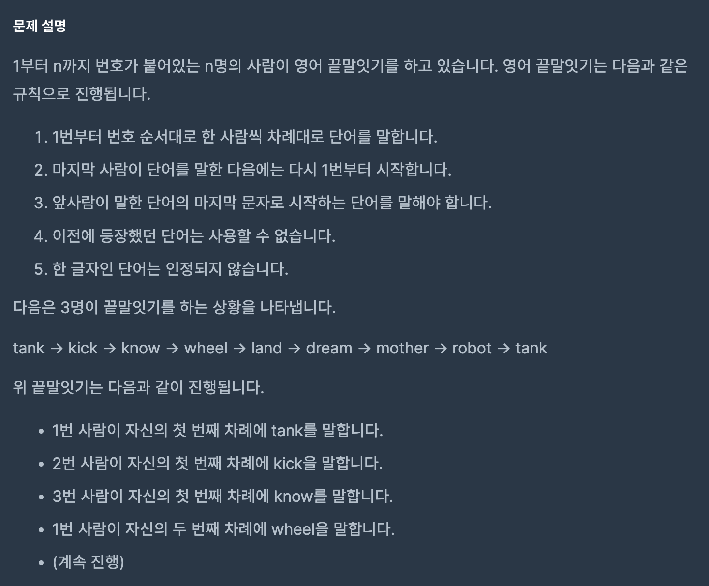 if 문 내부의 if문은 중복 단어가 있을 경우 바로 return을 해주는 부분이며, 중복된 단어가 없다면 appearWord에 단어를 계속 넣어주게 되어 있다. else문은 현재 단어의 마지막 글자와 다음에 나올 단어의 첫 글자가 다를 경우, 들어오게 되는데, 여기에서도 현재 단어가 등장했다면, 현재 말하고 있는 사람이 잘못된 단어를 말한 것이므로 현재 사람의 loop와 person을 출력해주고, 그것이 아니면 다음 사람의 person과 index를 출력해주면 된다.