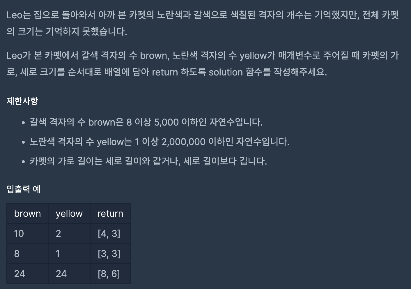 이것을 통과하고 (x - 2) * (y - 2) == yellow라면, 정답 길이를 찾은 것이다. 그러면 전체 카펫 가로 세로 길이인 [x, y]를 리턴해주면 된다.
