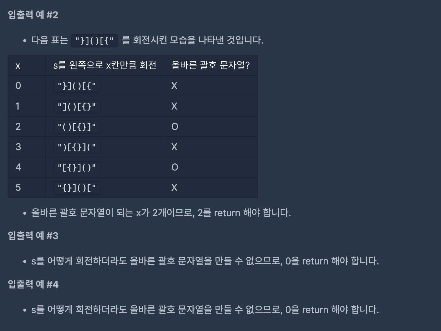 올바른 괄호인지를 물어보는 것이 아니라, 문자열을 회전시키면서 그것이 올바른 괄호인지를 판별하고, 그 개수를 리턴해야 하는 문제이다.