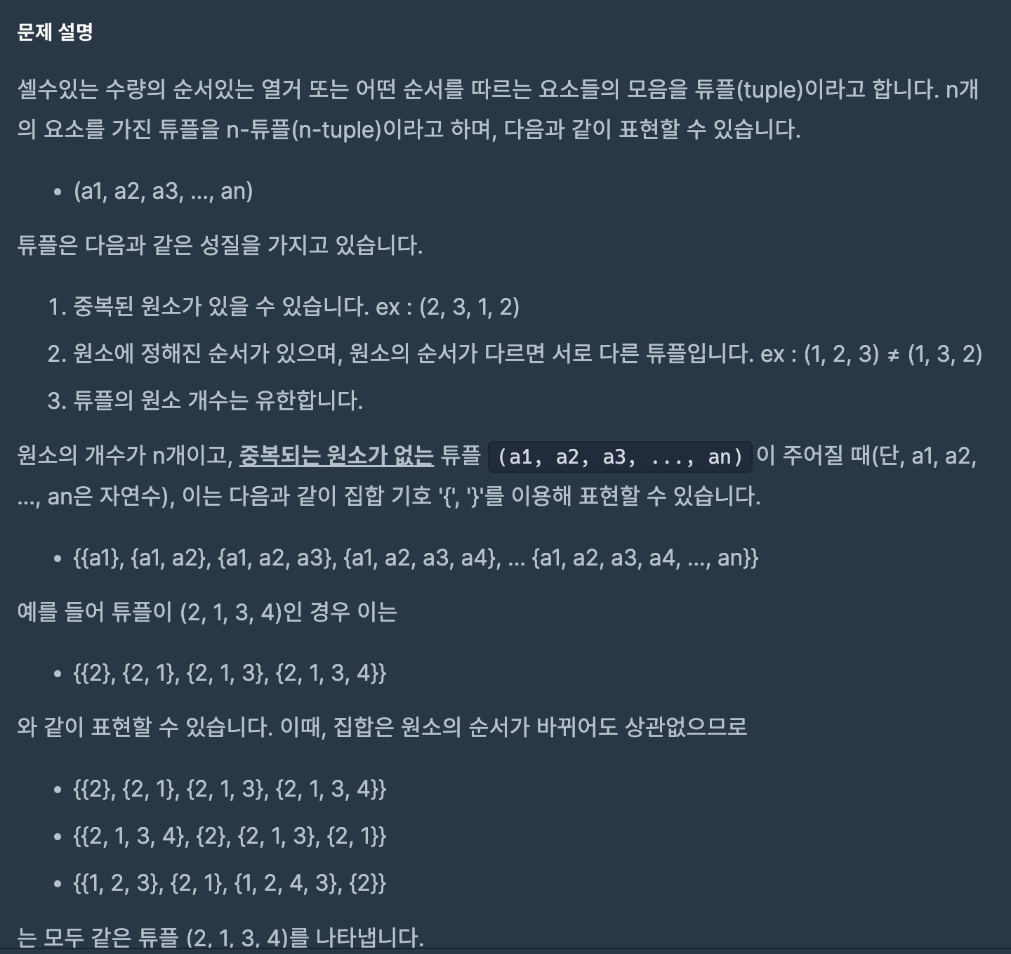 이는 원소의 순서가 바뀌어도 같은 튜플을 가리키는 n-튜플이라는 소리!