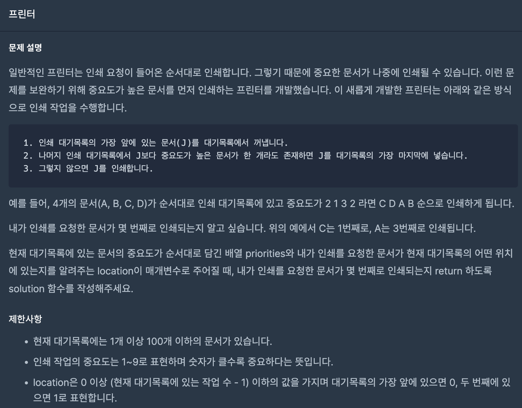 우선순위가 들어있는 배열이 주어지고, 내가 출력하고자 하는 프린트의 location이 주어진다.