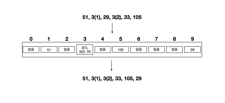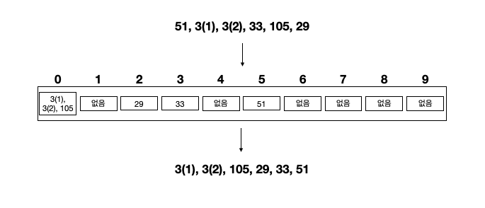 한 자리 수인 3의 경우 10의 자리수는 당연히 0이다. 그래서 0쪽의 bucket에 가서 담긴 것이고, 105는 순서상 마지막에 담길 수 밖에 없었다.