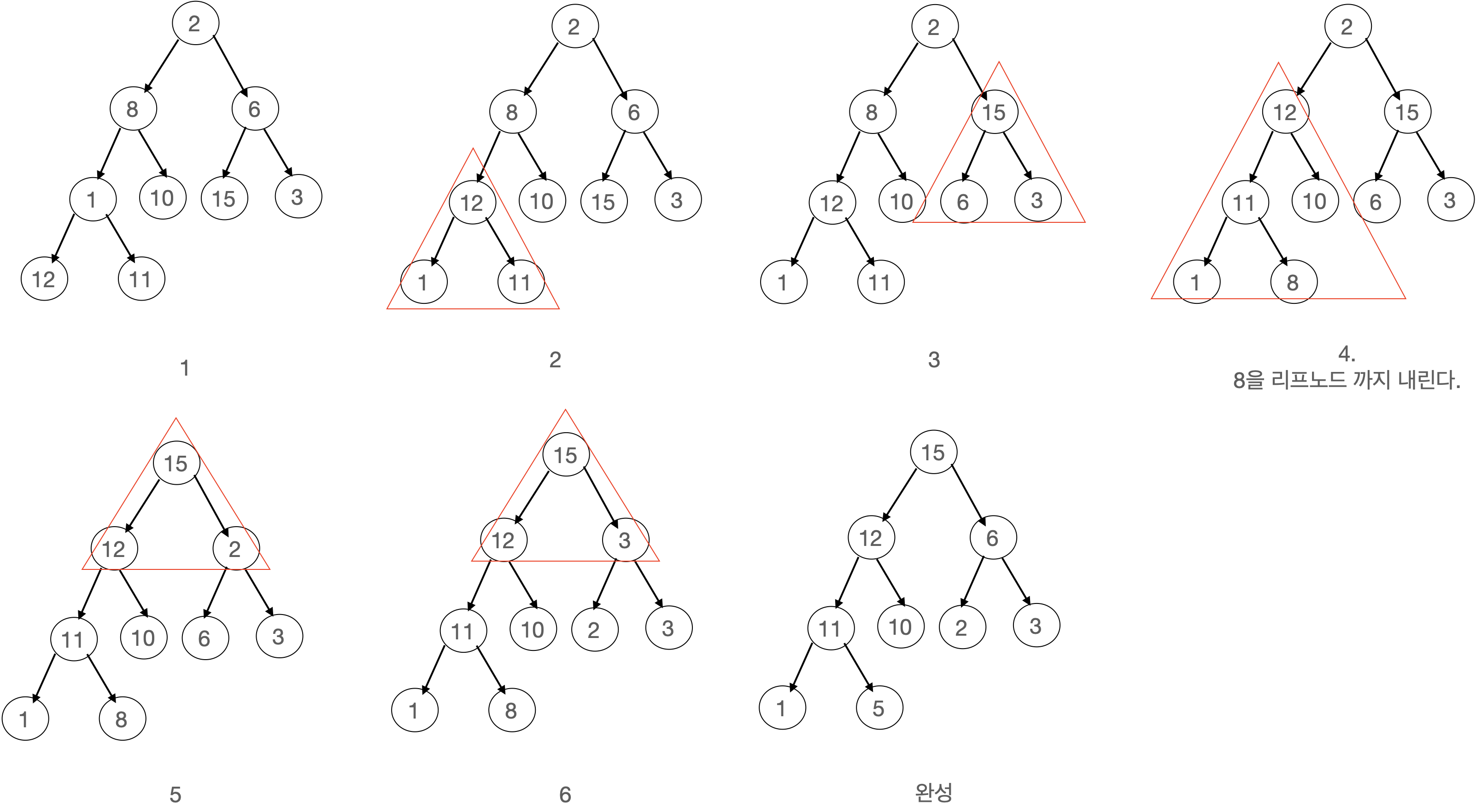 이렇게 전체 노드를 아래부터 바꾸어 나가면 전체 트리가 힙 성질을 만족하게 되는 결과를 얻을 수 있다.