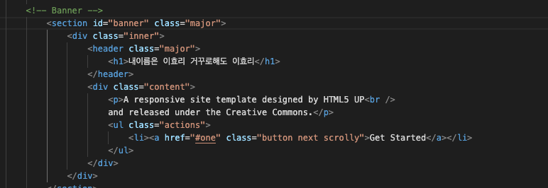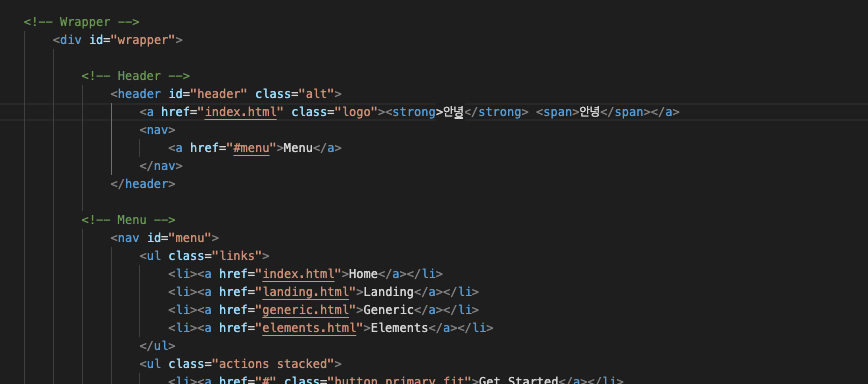 Free Download를 받으면 html, css, js 파일이 들어있는 폴더를 받게 되는데, index.html 파일을 열어보면 잘 정돈된 태그들이 우리들을 반겨준다.