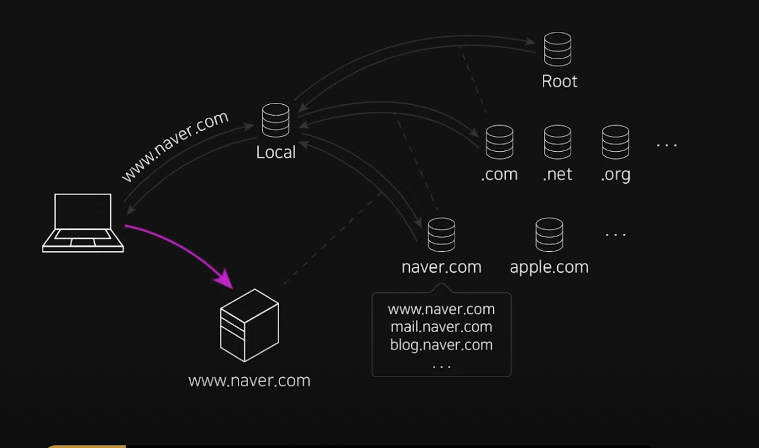 그렇게 해서 만약에 찾아진다면, ip 주소를 클라이언트에게 반환하고, 만약 찾는 도메인이 없다면, ‘서버를 찾을 수 없음’을 보게된다.