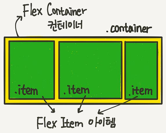 플렉스에서는 부모요소를 Flex Container라고 부르고, 자식 요소인 div.item들을 Flex Item(플렉스 아이템)이라고 부른다. 컨테이너가 Flex의 영향을 받는 전체 공간이고, 설정된 속성에 따라 각각의 아이템들이 어떤 형태로 배치되는 것이다.