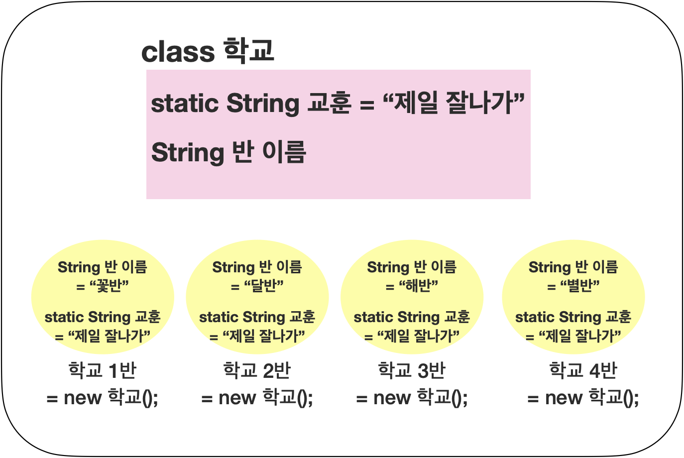 그러나 static의 경우, 변수를 ‘공유’한다. String 교훈은 정적 필드에 해당한다. 하나의 변수를 고치는 순간 원본 클래스부터 다른 인스턴스들의 ‘교훈’ 부분이 바뀌게 되는 것이다.