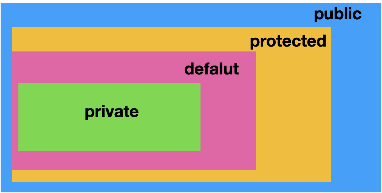 | private | 필드, 생성자, 메소드 | 모든 외부 클래스 |