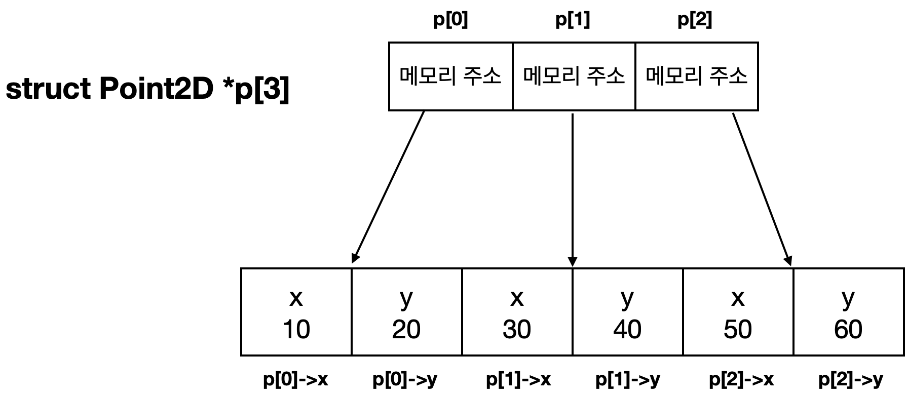 struct Point2D *p[3]; // 크기가 3인 구조체 포인터 배열 선언