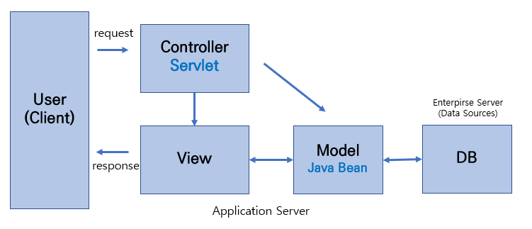 MVC1 패턴의 경우, View와 Controller를 모두 JSP가 담당하는 형태를 가진다. Java Bean이 Model을 담당한다.