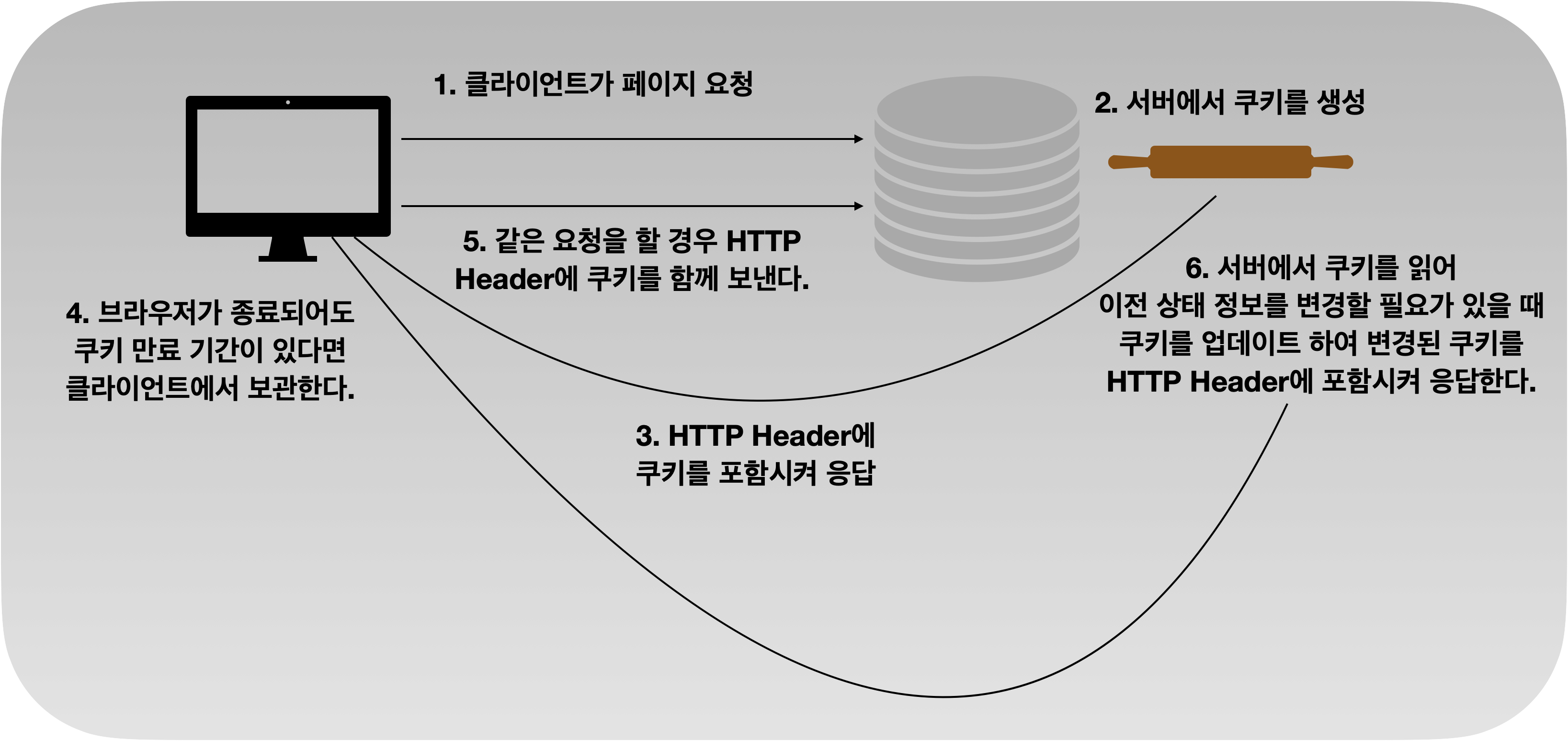 그런데 웹의 특성 중 '무상태성'은 구별은 고사하고 누가 접속했는지 기억도 못하는 상황을 만든다. 한 번 접속하고 문서를 반환하고 연결이 끊기는 무상태성은 누가 누구인지를 구별하는 것을 '기억'하고자 하는 것에 큰 걸림돌이 된 것이다.