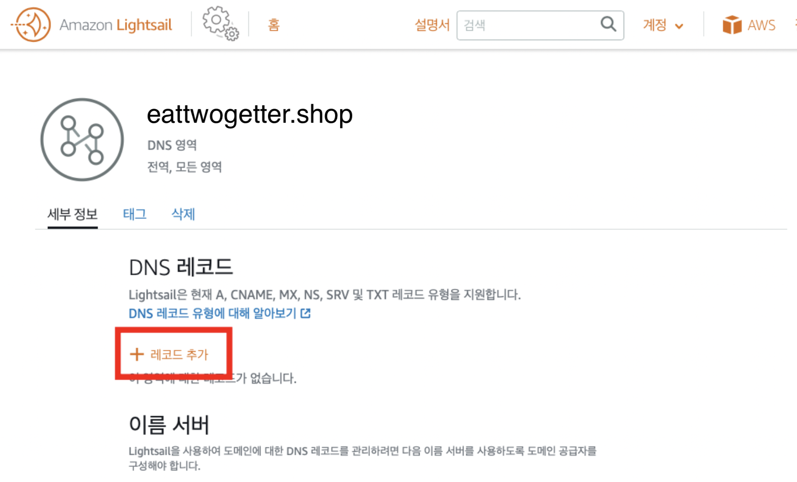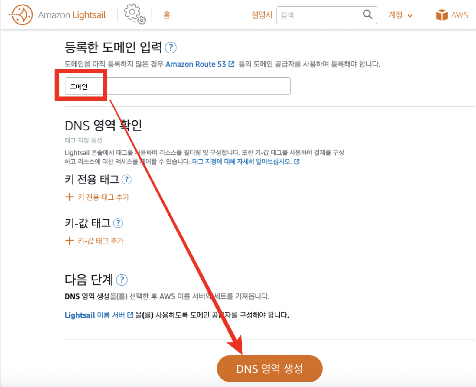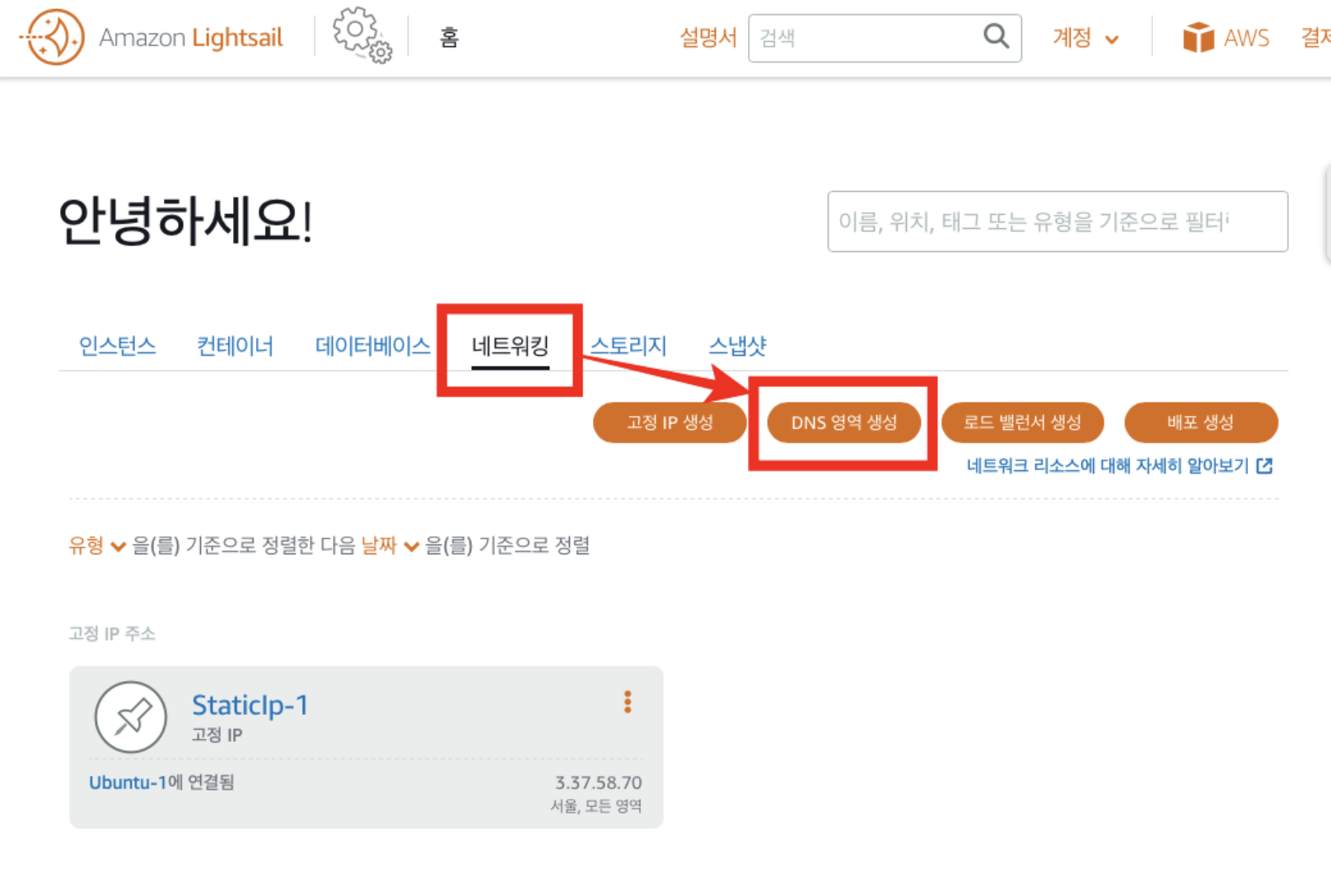 (1) 라이트세일 홈으로 들어간 후 네트워킹 탭에서 DNS 영역 생성을 누른다.