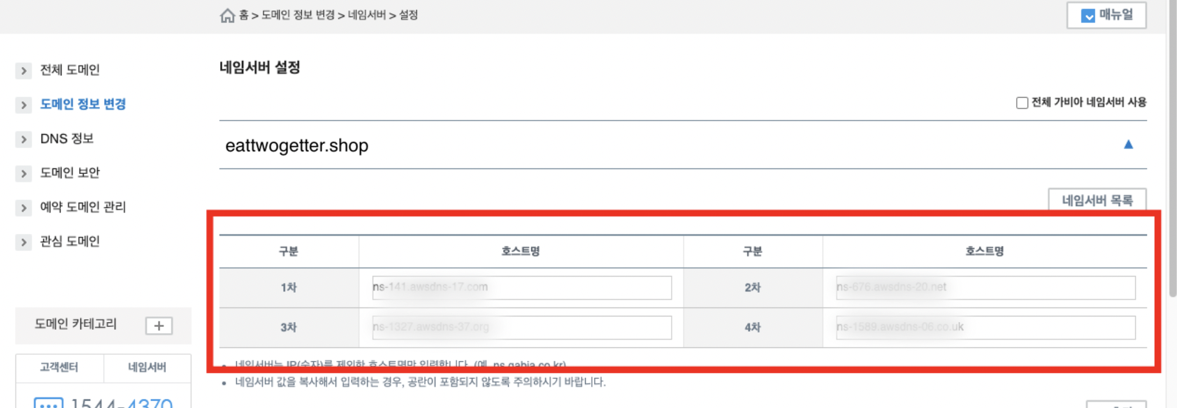 아래에 네임서버가 있다. 이것을 가비아든 카페24든지 설정을 해줘야 한다.