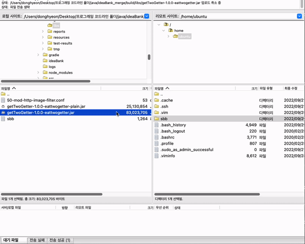 자, 이렇게 하면 jar 파일이 서버로 이동된 것이다. 이제 서버에서 jar 파일을 실행시키기만 하면, 우리가 설정해놓은 공인IP로 누구든지 우리의 서비스를 볼 수 있는 상황이 펼쳐진다.