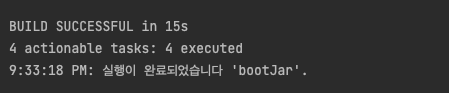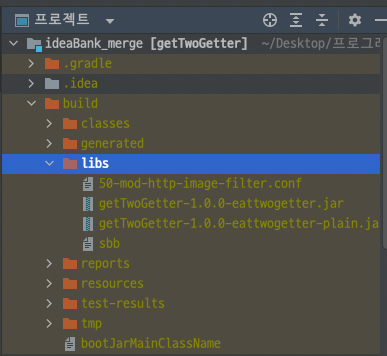 build 폴더 내 libs 라는 폴더가 있는데, 그 안에 방금 bootjar를 실행한 결과인 jar 파일이 들어가 있는 것을 볼 수 있다.