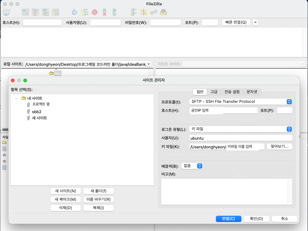 프로토콜, 호스트, 로그온유형, 사용자, 키파일을 알맞게 작성해준다.