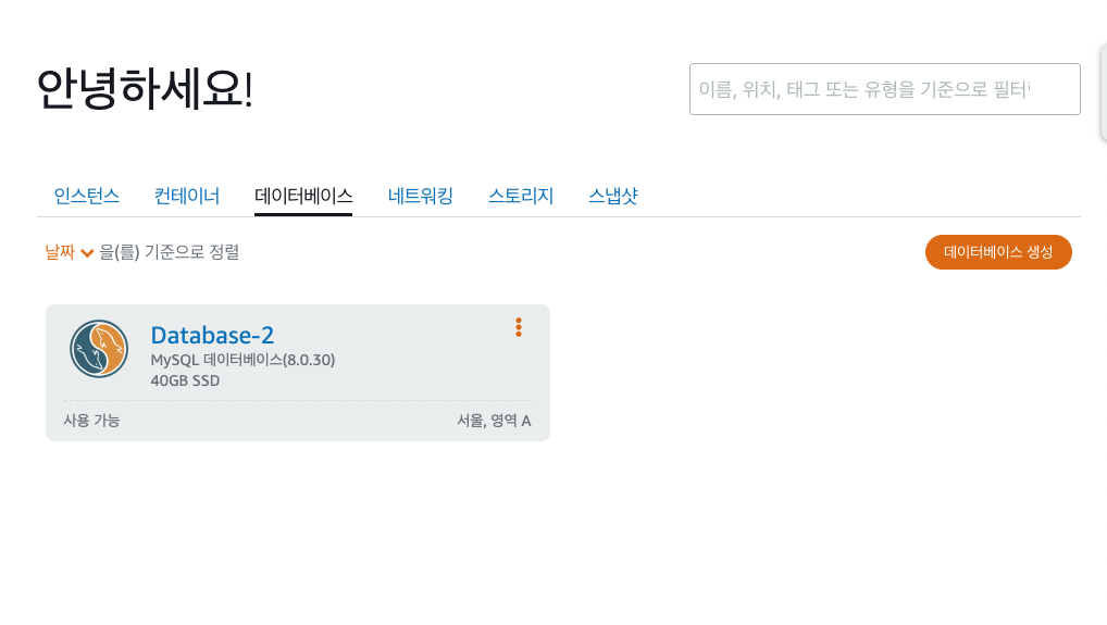 홈 - 데이터베이스 탭으로 넘어가서 데이터베이스 생성 클릭