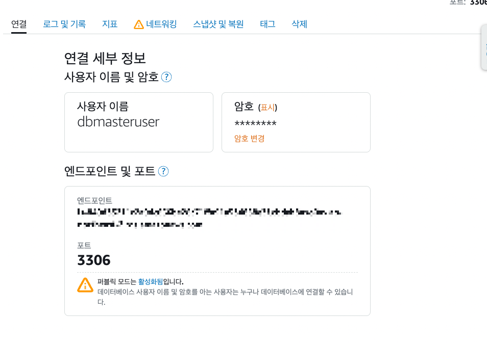 AWS 데이터베이스 탭에서 퍼블릭 모드를 활성화 시켜줘야 한다. '네트워킹' 탭에 퍼블릭 모드 활성화를 시키는 것이 있다.