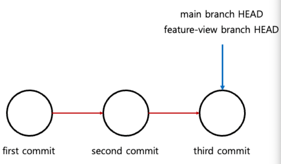 만약 메인 브랜치에서 git merge feature-view 명령어를 실행하면, main 브랜치의 HEAD가 feature-view 브랜치로 옮겨진다.