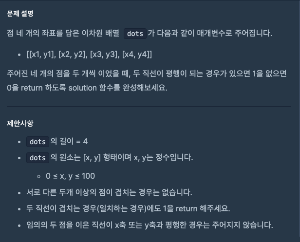 비교를 해서 만약 같다면, return 1을 해주고, 반복문을 전부 돌았는데도 리턴이 되지 않는다면, 평행하는 선분이 없는 것이기에 return 0을 해준다.