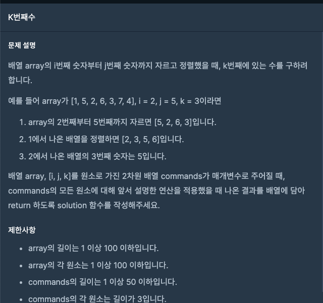 임시 배열을 반복문 안에 두고, 거기에 i번째부터 j번째까지 원소를 담고 정렬을 해서 k번째 수를 answer 배열에 담아서 최종 출력해주었다.
