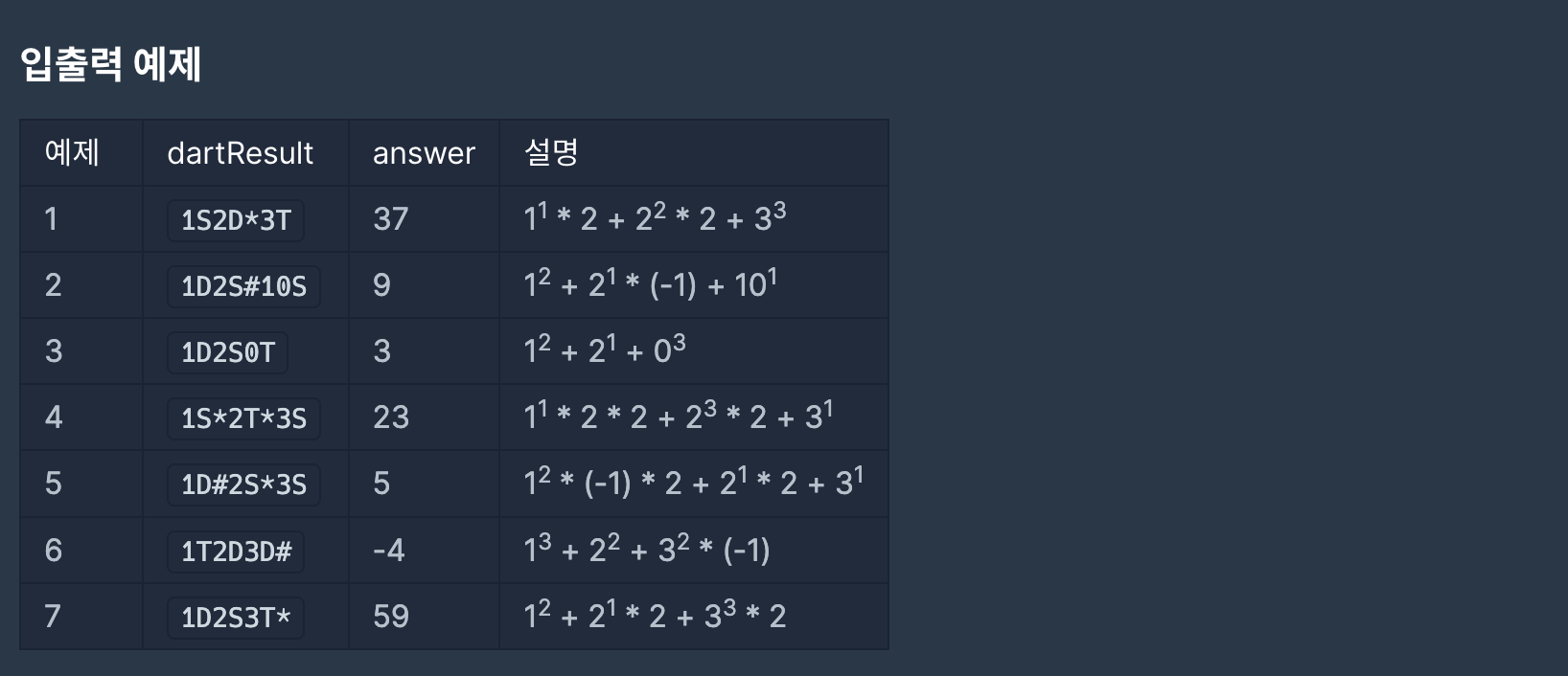 dartResult를 한 Character로 끊어서 읽고, 숫자 또는 문자라면 그 안에서 적절하게 분기를 해주고, 만약 그 둘이 아니라면 * or # 이므로 그에 따라 이전 회차의 점수를 두 배 시켜주거나 하나만 두 배를 시켰다.